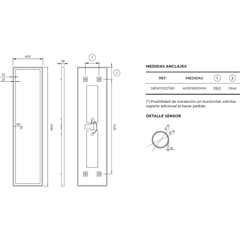 ◦ Espejo rectangular vertical con luz frontal a través del arenado.